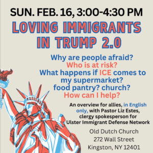 Pastor Liz Estes’s overview of new executive orders affecting immigrants is open to all and a prerequisite for UIDN volunteers interested in being Know Your Rights trainers. Bring your questions. Learn what UIDN and other groups are doing. Everyone can help. This session is for allies and will be in English only. There will be no Spanish-language interpretation. Old Dutch Church is at 272 Wall Street in Kingston.