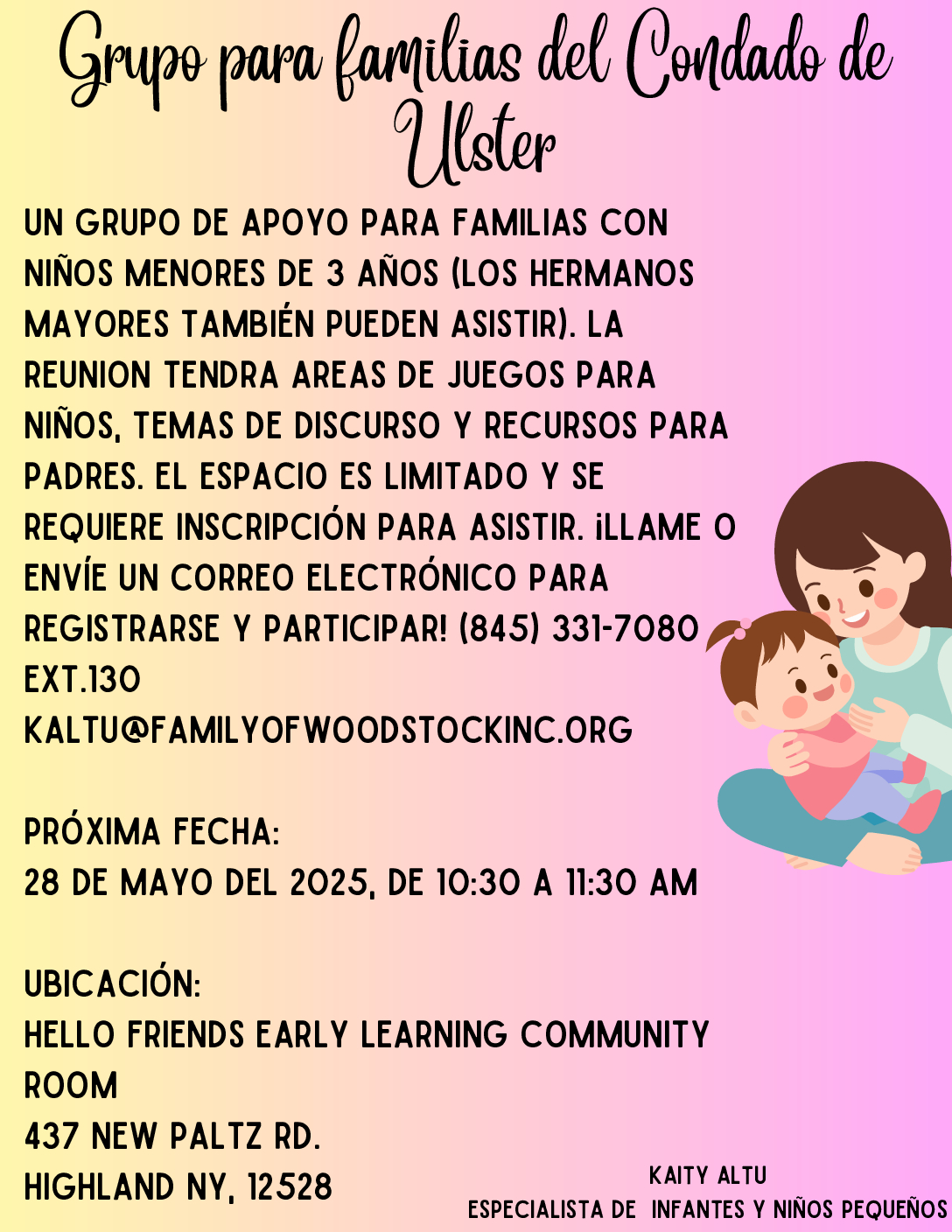 Bilingual family support and playgroup for children under 3 (older siblings welcome). There will be play areas, discussion, and parenting resources. Download flyer in English or Spanish.