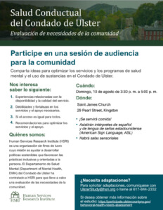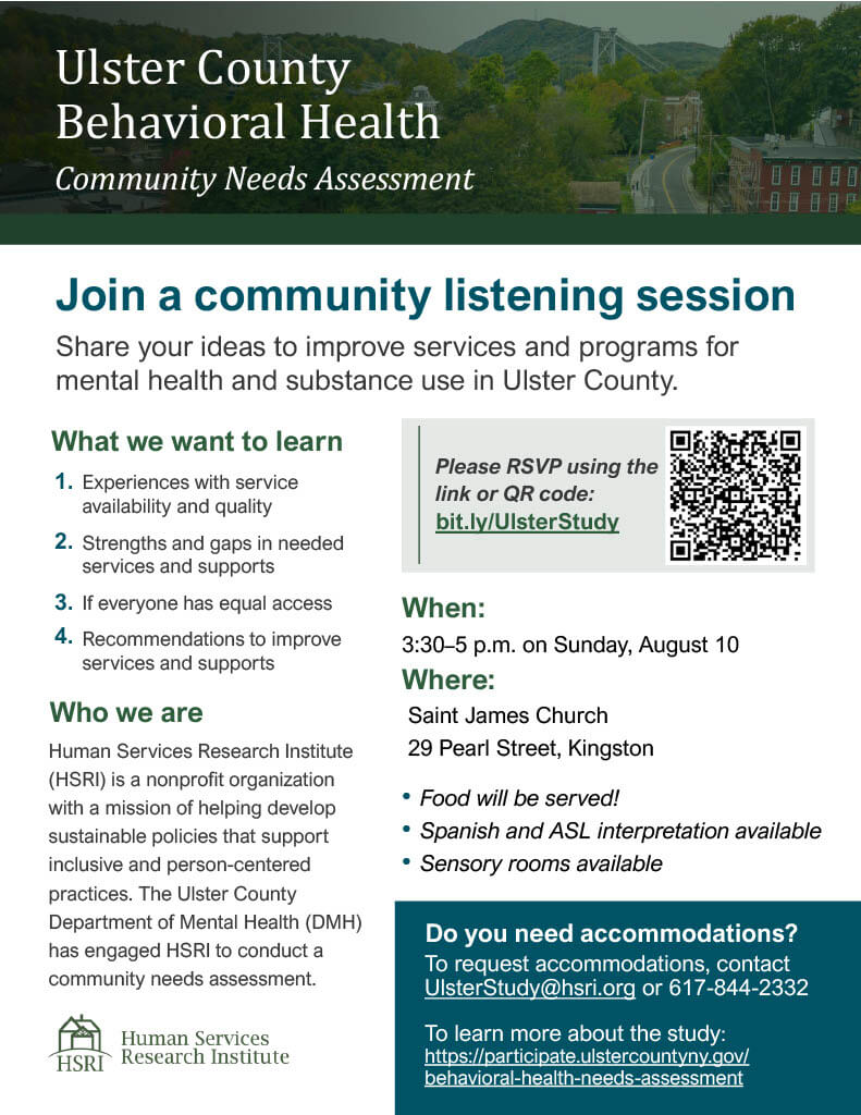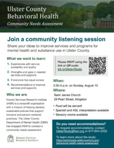 Share your ideas for improving services and programs for mental health and substance use in Ulster County including availability, accessibility, and quality and strengths and gaps in supports. 🥑 🍉 Food will be served. Spanish and ASL interpretation available. To request accommodations: UlsterStudy@hsri.org or 617-844-2332. More about the study, https://participate.ulstercountyny.gov/behavioral-health-needs-assessment.