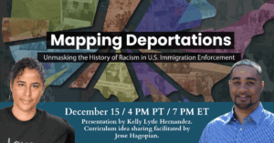 Site co-creator and award-winning historian Kelly Lytle Hernandez will provide an introduction to the purpose and design of the site, including how the history of anti-immigrant legislation and racism are intertwined. Participants will meet in small groups to brainstorm ways to integrate the site in curriculum, followed by time to ask Hernandez questions and discuss ideas. Free. Donations welcome.