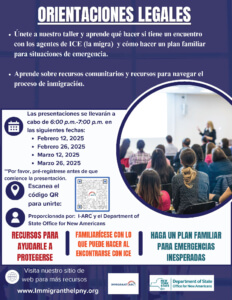 Immigrant ARCÚnete a nuestro taller y aprende qué hacer si tiene un encuentro con los agentes de ICE (la migra) y cómo hacer un plan familiar para situaciones de emergencia. Aprende sobre recursos comunitarios y recursos para navegar el proceso de inmigración. Por favor, utiliza el código QR para registrarte antes de que comience la presentación. Proporcionada por: I-ARC y el Department of State Office for New Americans.
