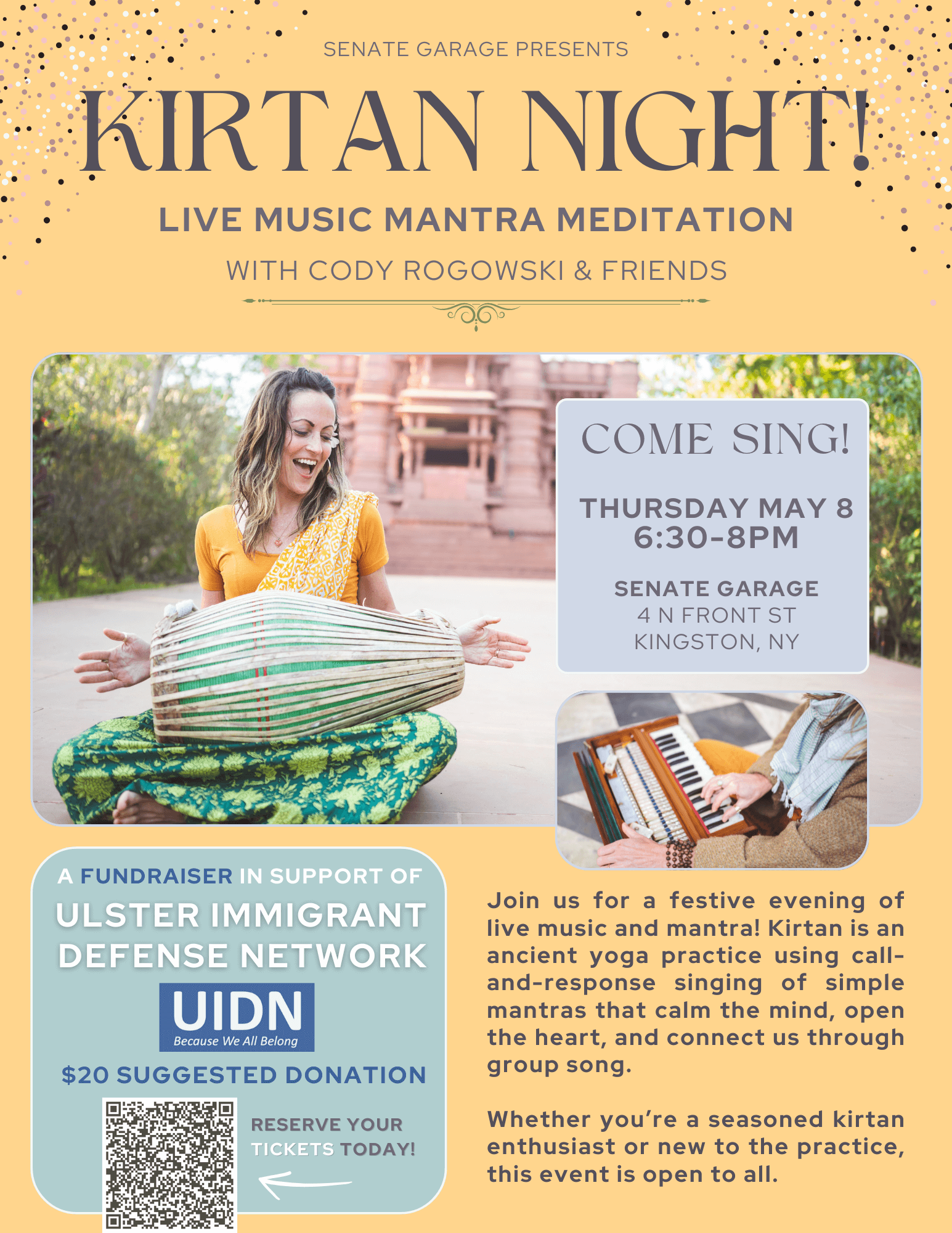 A festive evening of live music and mantra. Kirtan is an ancient yoga practice using call-and-response singing of simple mantras that calm the mind, open the heart, and connect participants through song. All are welcome — seasoned enthusiasts and newcomers. Download the flyer and use QR code to register.