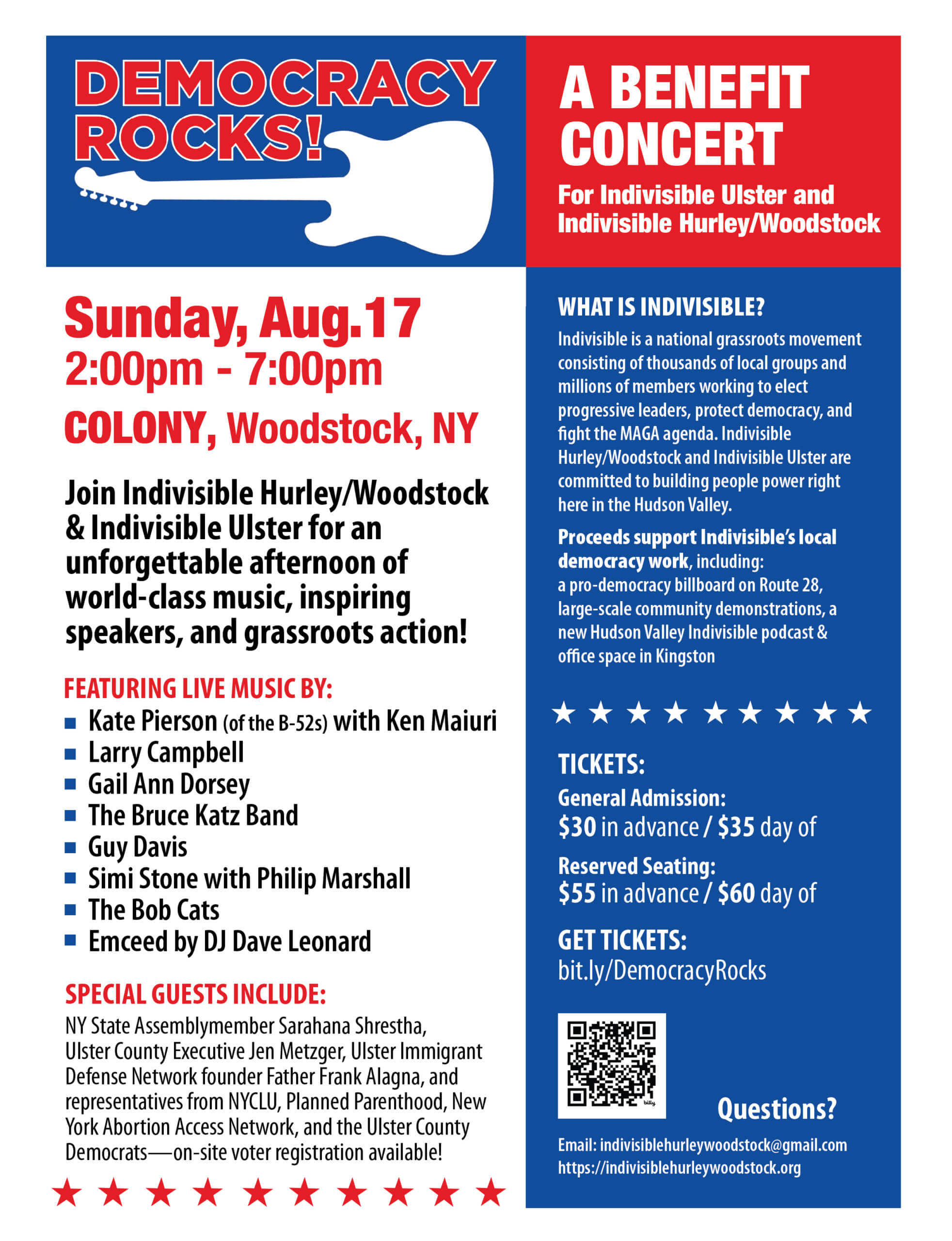 A benefit concert to support Indivisible’s local democracy work, including a pro-democracy billboard on Route 28, large-scale community demonstrations, a new Hudson Valley Indivisible podcast and office space in Kingston. LIVE MUSIC by the B-52's Kate Pierson with Ken Maiuri, Larry Campbell, Gail Ann Dorsey, The Bruce Katz Band, Guy Davis, Simi Stone with Philip Marshall, and The Bob Cats. Emcee: DJ Dave Leonard.