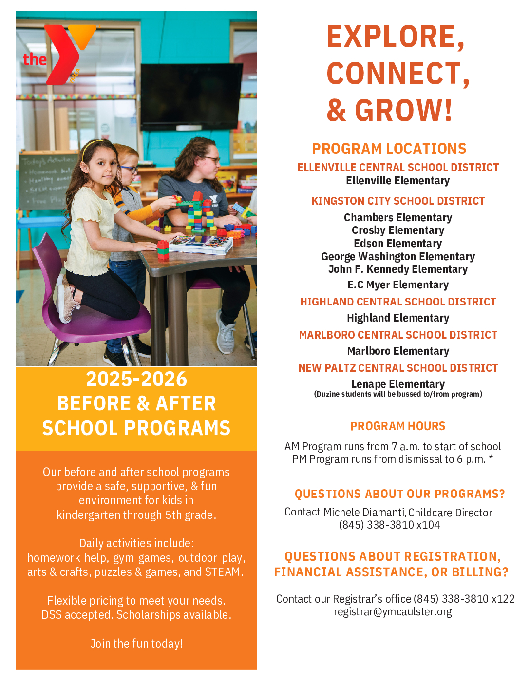 YMCA of Kingston and Ulster County offers before and after school programs at elementary schools in Kingston, Ellenville, Highland, Hurley, Lake Katrine, Marlboro, and New Paltz. For more information call 845-338-3810 or email ymcachildcare@ymcaulster.org. Financial assistance may be available.
