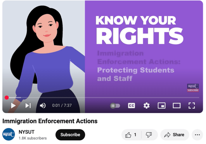 Click on the picture above for a seven-and-a-half minute video that can help administrators and staff feel confident about protecting students and reacting appropriately if ICE comes to your school. Produced by NYSUT – A Union of Professionals.